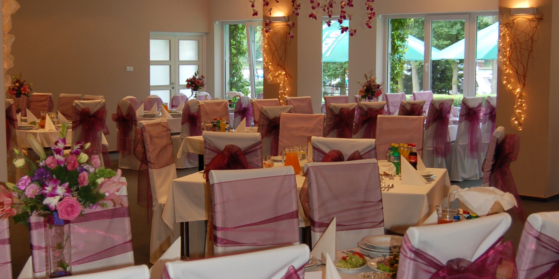 - klimatyzowane sale restauracyjno – konferencyjne (w tym 2 z bezpośrednim wyjściem na taras i widokiem na jezioro) mogące pomieścić od 30 do 120 osób;